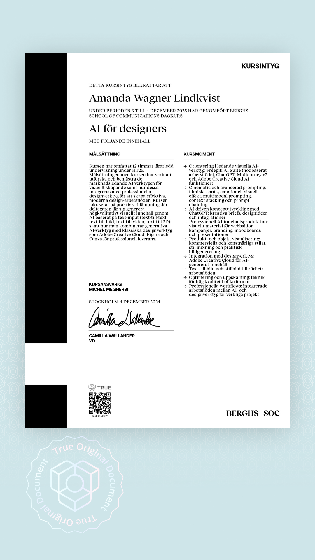 Alla TRUE -document är säkrade med blockchain-teknologi och kan verifieras som äkta. Klicka på verifieringsknappen bredvid dokumentet eller skanna QR-koden med din smartphones kamera. Ingen app krävs - dokumentets äkthet verifieras omedelbart.