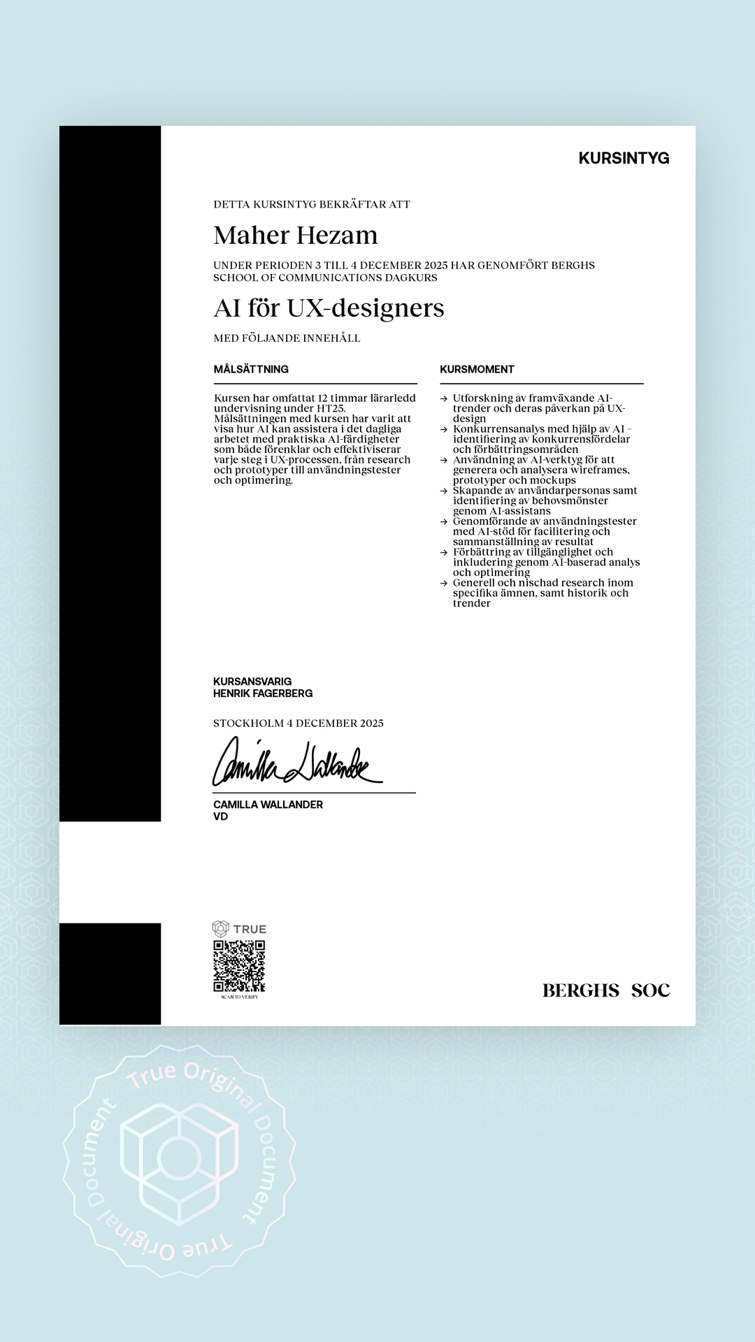 Alla TRUE -document är säkrade med blockchain-teknologi och kan verifieras som äkta. Klicka på verifieringsknappen bredvid dokumentet eller skanna QR-koden med din smartphones kamera. Ingen app krävs - dokumentets äkthet verifieras omedelbart.